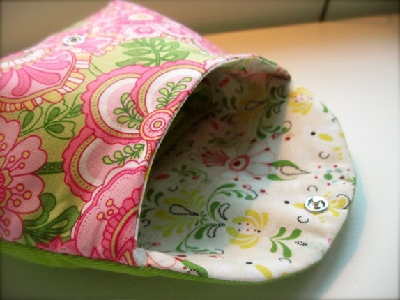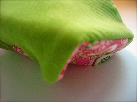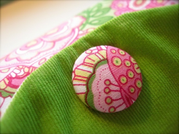 Baksiden og lokket er limegrønn smal fløyel. Fóret med passende stoff i bomull. Lukkes med trykknapp. Pyntet på lokket med en knapp trukket i stoff.