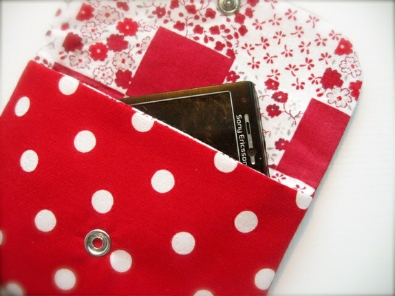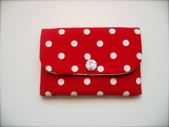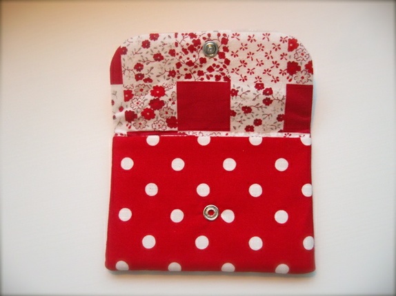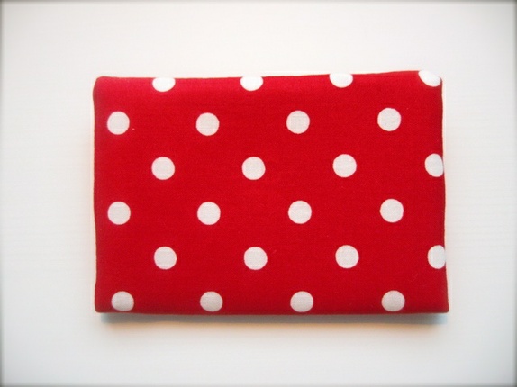 Et lite etui sydd av trivelige stoffer i god kvalitet. Rød med hvite prikker. Fóret med mønstret stoff i rødt og hvitt.