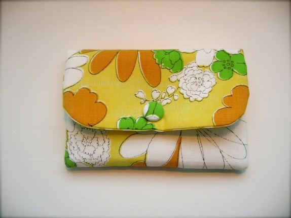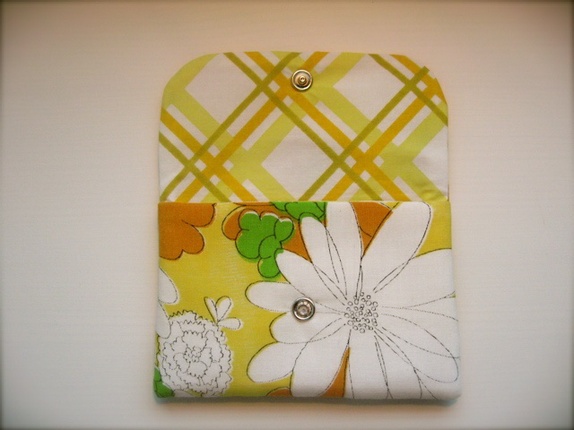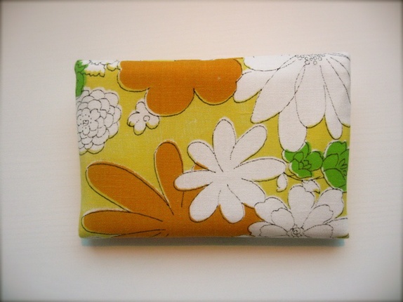 Et lite etui sydd av vintage stoffer i gule og grønne nyanser. Fóret med vintage stoff i ruter - gult og hvitt.
