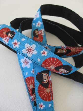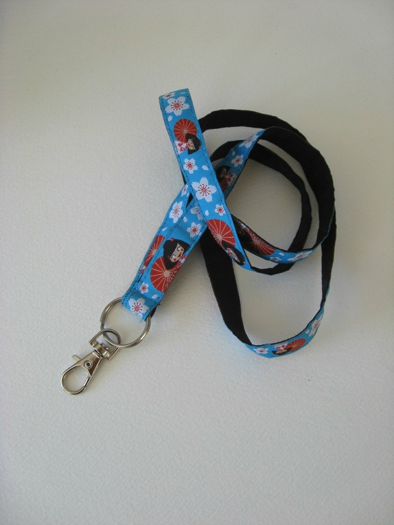 Nøkkelbånd sydd av et nydelig, vevd bånd med sort ripsbånd på baksiden. Båndet er turkis med motiv av små geishadamer med rød parasoll og hvite kirsebærblomster svevende rundt...