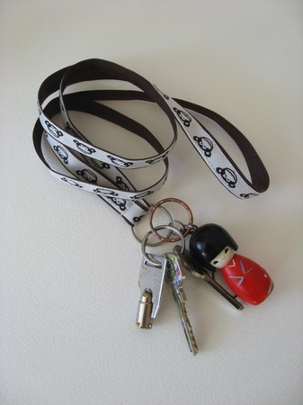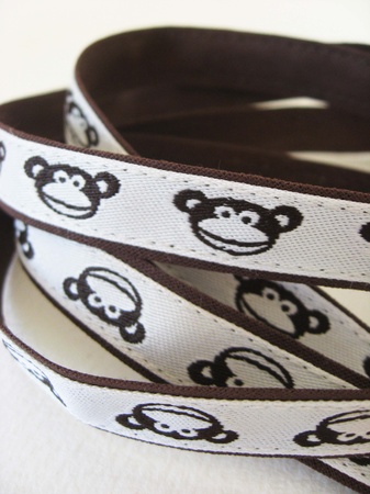 Nøkkelbånd sydd av et nydelig, vevd bånd med brunt skråbånd på baksiden. Båndet er lyst beige med motiv av små brune apekatter...