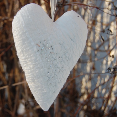 Hjerter i nunofilt. Nunofilt gir et spennende uttrykk med ugjevne flater i tåvet ull og silke. Hjertene har vi dekorert med perler og kryss i sølv trå.