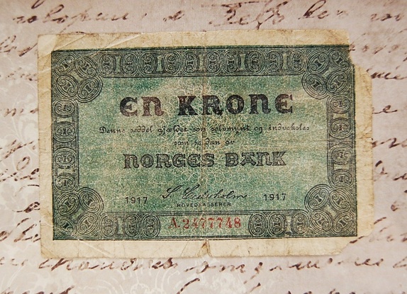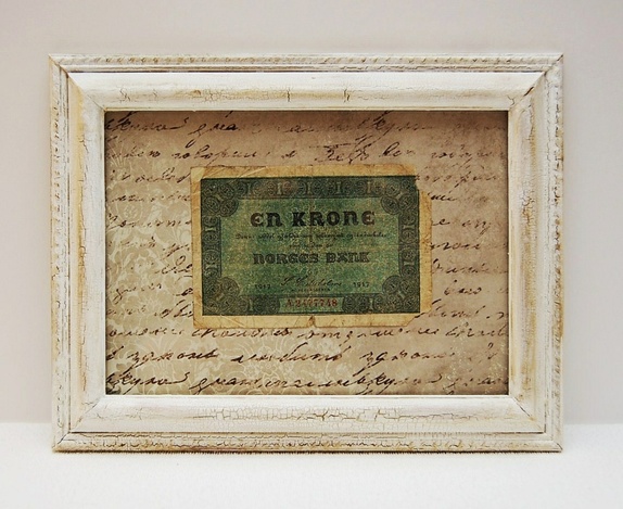 Dette er en ekte 1-kroning fra 1917, rammet inn i en ramme som er nøye behandlet med flere lag beige -og hvitmaling samt krakkelering for å gi den antikke ''looken''