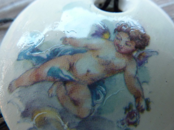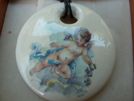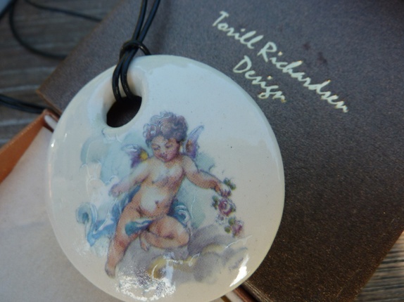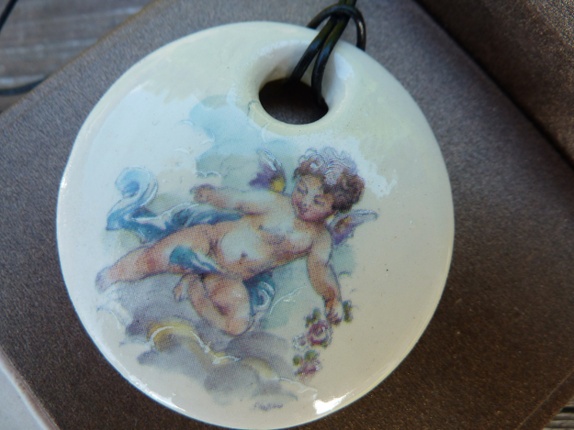 Halssmykke er laget av leirgods og er brent 3 ganger.Jeg har brukt dekal av en engel som dekor.Diameter 5 cm.Lærsmor med segulerbar knute.Smykke eske følger med.