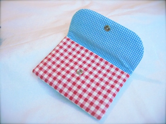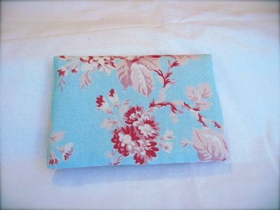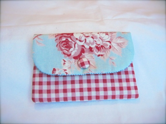 Et lite etui sydd av trivelige stoffer i god kvalitet. Blå bunn med røde roser. Ruter i rosa, rød og hvit.
