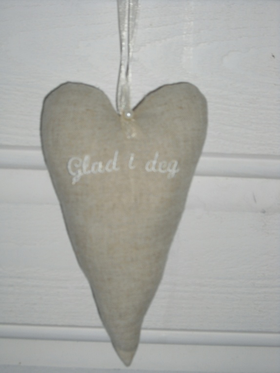 Hjerte sydd i naturfarget lett lin.Masinbrodert tekst "glad i deg".