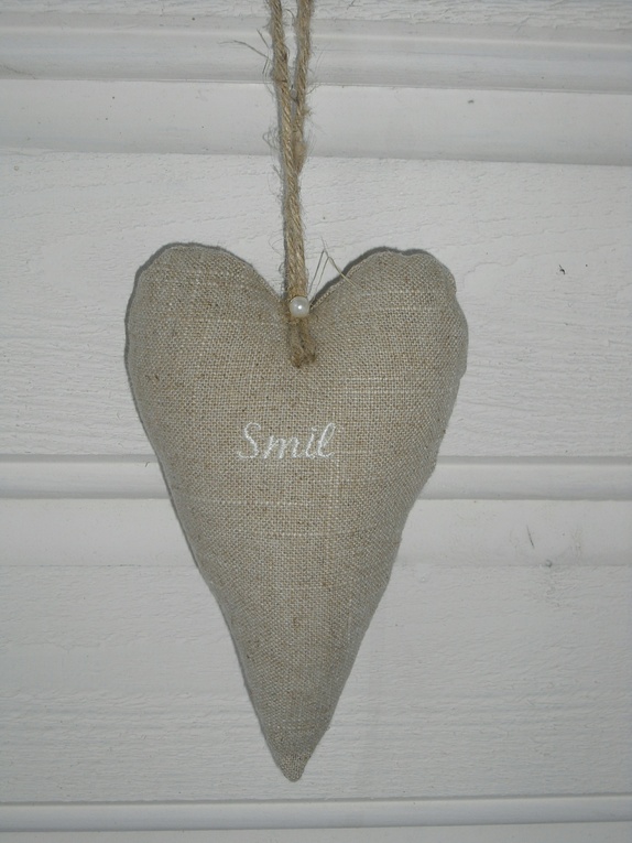 Hjerte sydd i naturfarget lin.Maskinbrodert tekst "smil".
