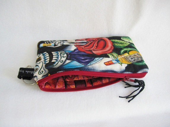 Liten kjekk pung i bomullstoff, innleggsvatt og fòr.Lomme for kort.Nøkkelring og karabinkrok slik at den kan brukes til nøkler etc. Fin til oppbevaring av småsaker bl.a som make-up , myntpung etcMaskinquiltet.10,5 x17,5 cm.