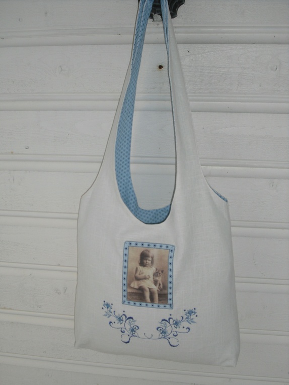 Forsiden har maskinbrodert motiv og vintagebilde med bånd rundt.