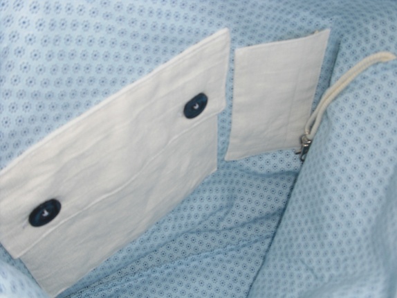 Vesken har nøkkelkrok og to lommer innvendig. En mobillomme og en stor lomme som lukkes med knapper.