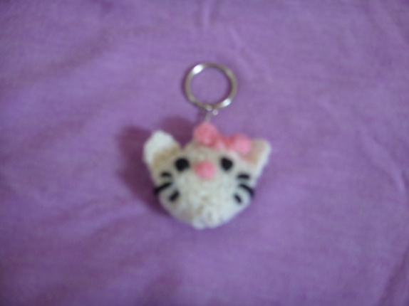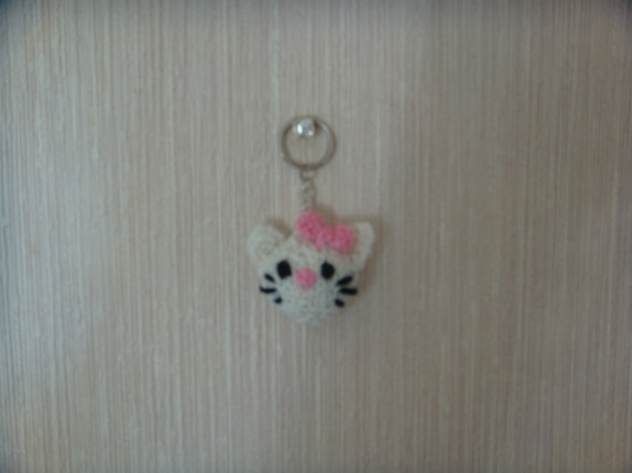 Hello Kitty er 7,5 cm lang med lenke og ring.Hun er strikket og fylt med fyllvatt.På bak siden er hun bare hvit.