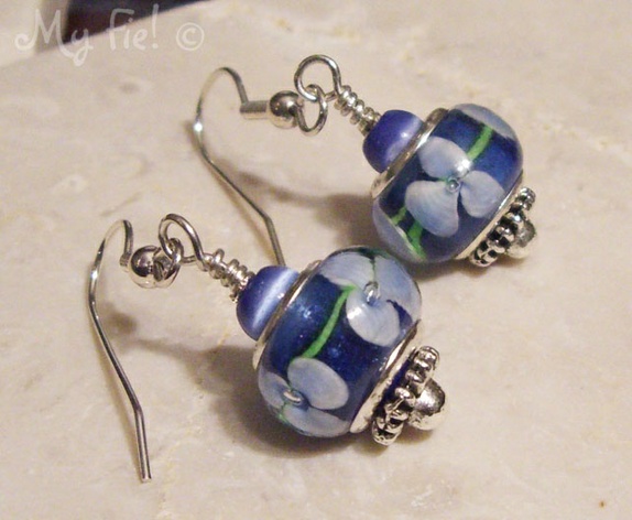 Nydelig lampwork perler i blått med blå blomster, sølvkjerne og tigerøye. Øredobbene er ca 2 cm lange fra kroken slutter.