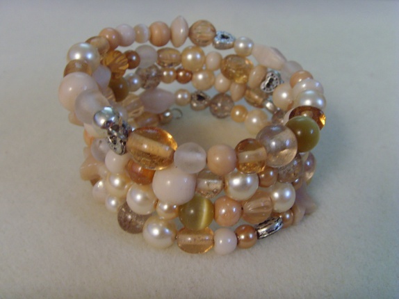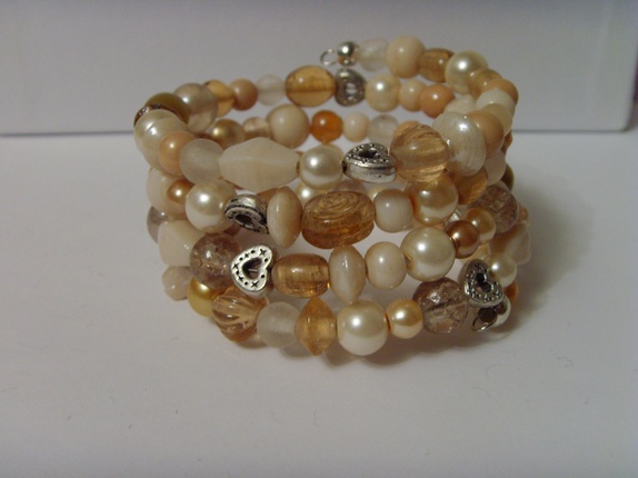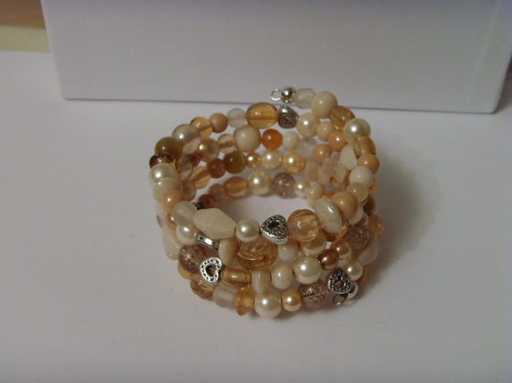 Armbåndet består av 4 ringer med memorywire, med forskjellige glassperler og metallperler. Alt metall er nikkelfritt.