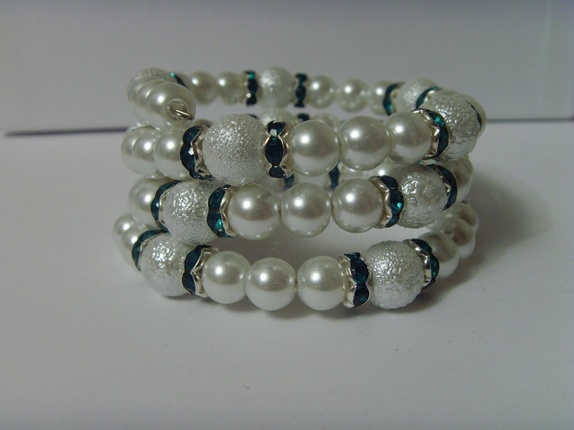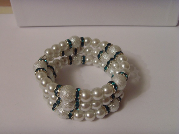 Armbåndet består av 3 ringer med memorywire, med 8mm hvite glassperler. Det er sølvrondeller med grønne krystaller med jevne mellomrom.