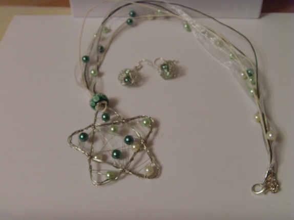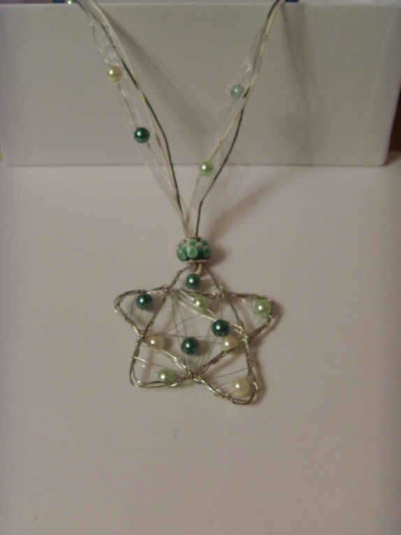 Håndlaget stjerne av sølvfarget kobbertråd. Det er pyntet med noen glassperler i grønt og hvitt. Kjedet består av organzabånd, bomullstråder og kobbertråd med perler.