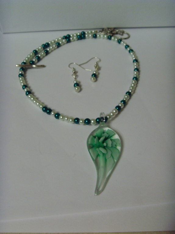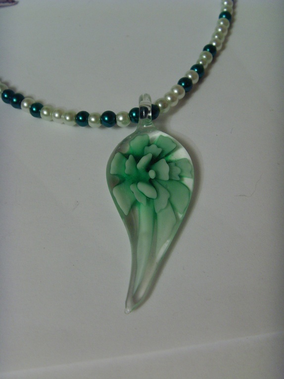 Smykket består av 4mm små glassperler. Fargene går igjen i glassanhenget som er ca 6 cm langt.