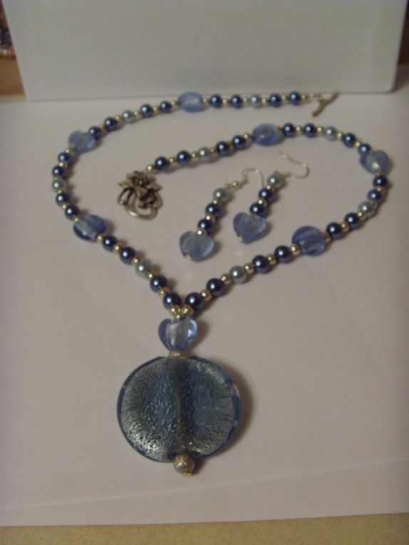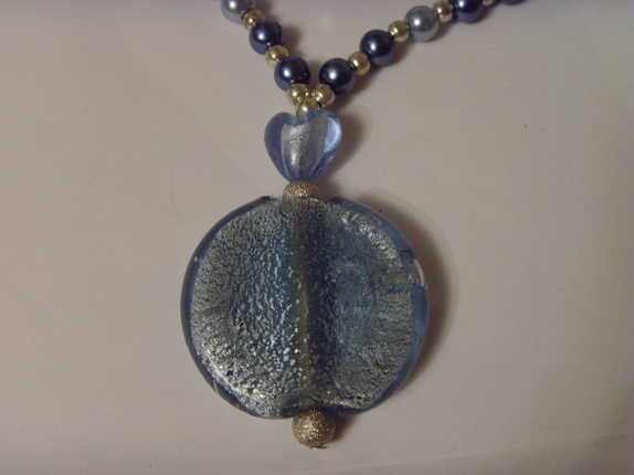 Kjedet består av glassperler i forskjellige nyanser med nikkelfrie metallperler mellom.Med jevne mellomrom er det sølvfolierte glassperler. Fokusperlen er en ca 3 cm glassperle med sølvfolie. Smykket er ca 44 cm langt.