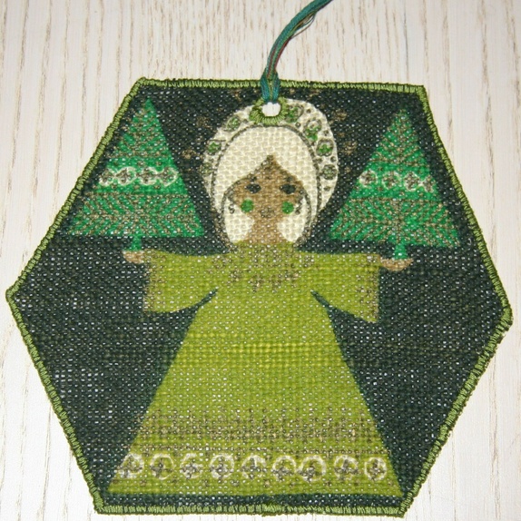 Baksiden er av vliseline som det er lett å skrive på med en tusjpenn. Etter at gavene er pakket opp egner d seg gpdt som juletrepynt. Det er 4 engler i pakka, to lysegrønne og to mørkegrønne og 4 pakker tilgjengelig som vil bli lagt ut hver for seg.