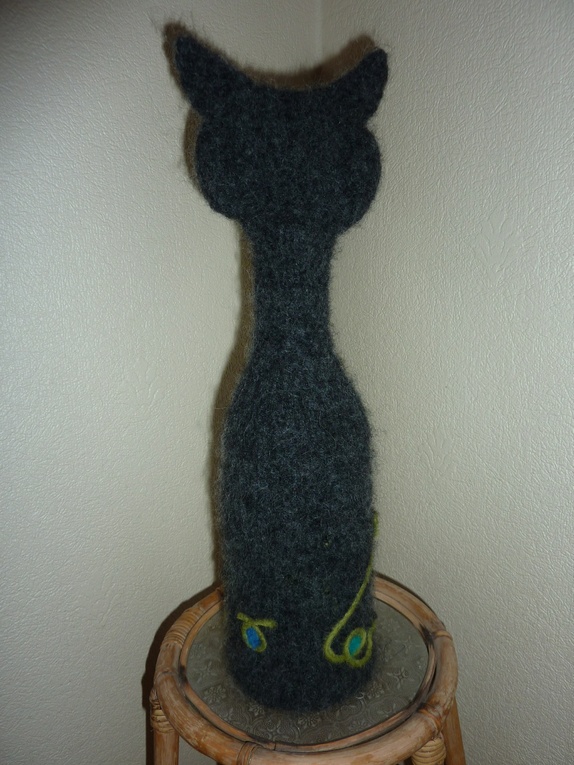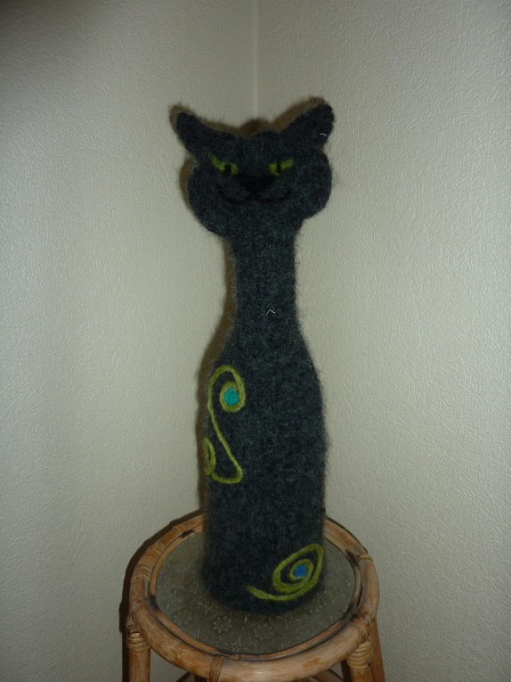 Strikket og tovet vinkatt til å skjule 0,75 l vinflaske eller annen type flaske.
