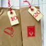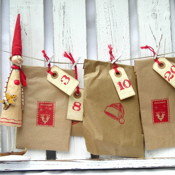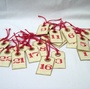 Lappene har svertede kanter for en vintage look, og tallene 1-24 er håndstemplet i rødt. Adventslappene har røde jutebånd.