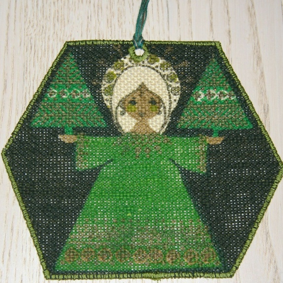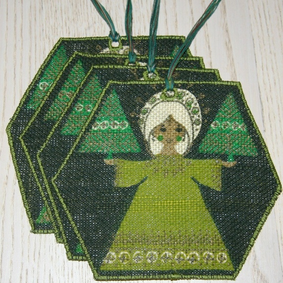 Baksiden er av vliseline som det er lett å skrive på med en tusjpenn. Etter at gavene er pakket opp egner d seg gpdt som juletrepynt. Det er 4 engler i pakka, to lysegrønne og to mørkegrønne og 4 pakker tilgjengelig som vil bli lagt ut hver for seg.
