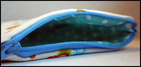 Pung med soppmønster, mellomblå glidelås og foret er lys blå polkadot.