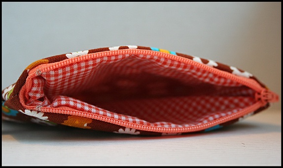 Pung med dyr og blomster, orange glidelås og orangerutet innerstoff.