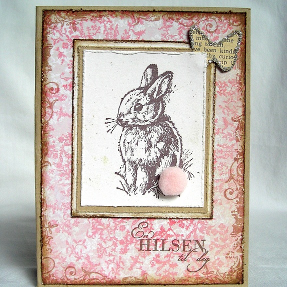 Det er pyntet med vakkert designpapir og et håndstemplet motiv av en harefrøken med lys rosa haletupp av pompong, samt en sommerfugl med kanter av sølv glassglitter. Svertede kanter gir en vintage look. "En hilsen til deg" er håndstemplet i sjokoladebrunt. Kortet passer til alle anledninger.