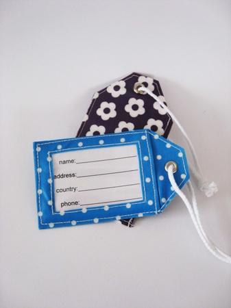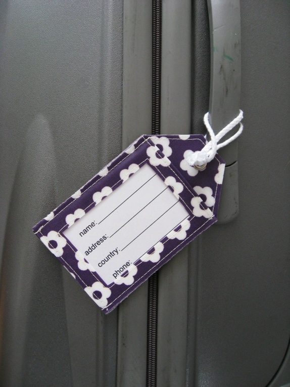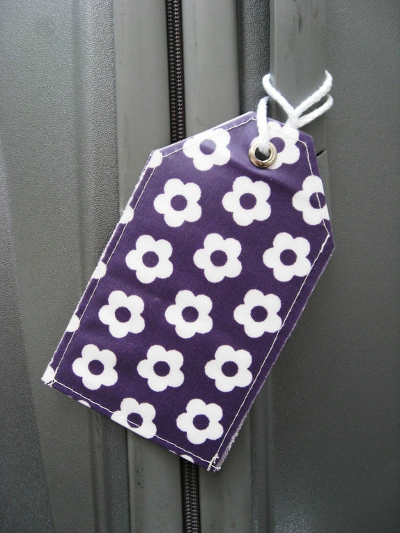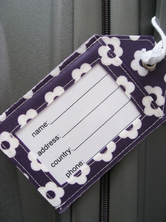 Søt koffertlapp i lilla med et mylder av hvite blomster. Koffertlappen er sydd i et plastbelagt bomullsmateriale med "vindu" i plast. Selve lappen er stivet opp med samme plast som er benyttet i "vinduet". På toppen er det festet en malje. Koffertlappen festes på kofferten med en snor i bomull.