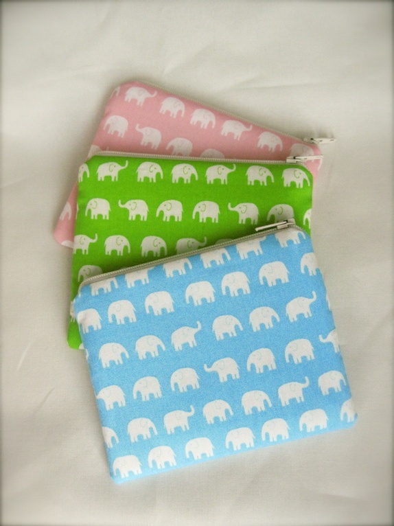 En liten og nett pung i grønn bomull med små hvite elefanter på rekke og rad. Fóret med bomull med hvite og grønne ruter.
