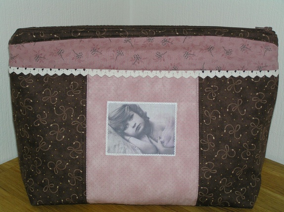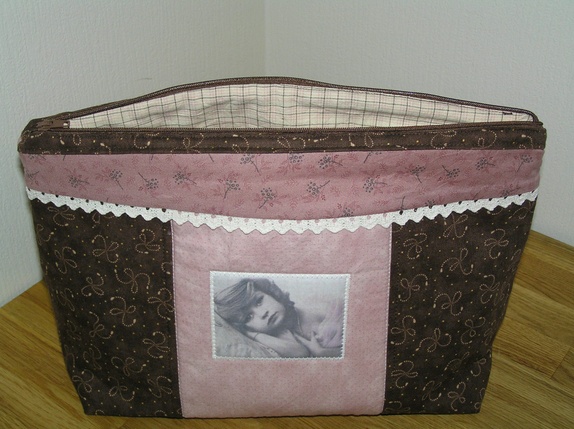 Toalettmappe med gammeldags motiv. Ca. 32 x 25 cm