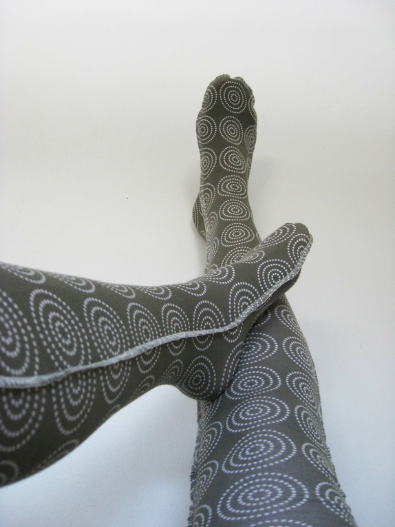 Lange, deilige knestrømper som rekker godt over knærne. De er sydd i en lys mosegrønn bomullsjersey med store hvite sirkler. Knestrømpene er fasongsydd med en dekorativ overlocksøm på utsiden og i avslutningskanten oppe. De finnes i 2 størrelser: 36-38 og 39-41.