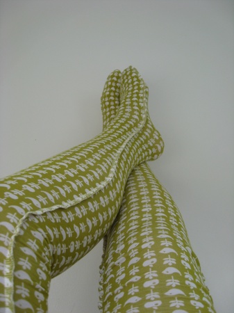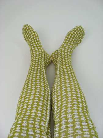 Lange, deilige knestrømper som rekker godt over knærne. De er sydd i en syrlig grønn bomullsjersey med små fugler og epler i hvitt. Knestrømpene er fasongsydd med en dekorativ overlocksøm på utsiden og i avslutningskanten oppe. De finnes i 2 størrelser: 36-38 og 39-41.