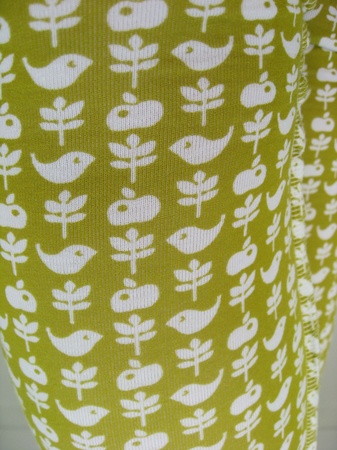 Lange, deilige knestrømper som rekker godt over knærne. De er sydd i en syrlig grønn bomullsjersey med små fugler og epler i hvitt. Knestrømpene er fasongsydd med en dekorativ overlocksøm på utsiden og i avslutningskanten oppe. De finnes i 2 størrelser: 36-38 og 39-41.
