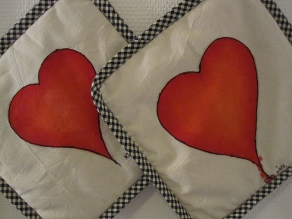 2 stk. Hjertelige røde grytekluter. Håndmalt dekor på vasket bommullslerret. Sort/ hvit rutete kantebånd og bakstykke. Ingen er helt like.Vask 60 grader.Selges kun som par, kr 165,00.