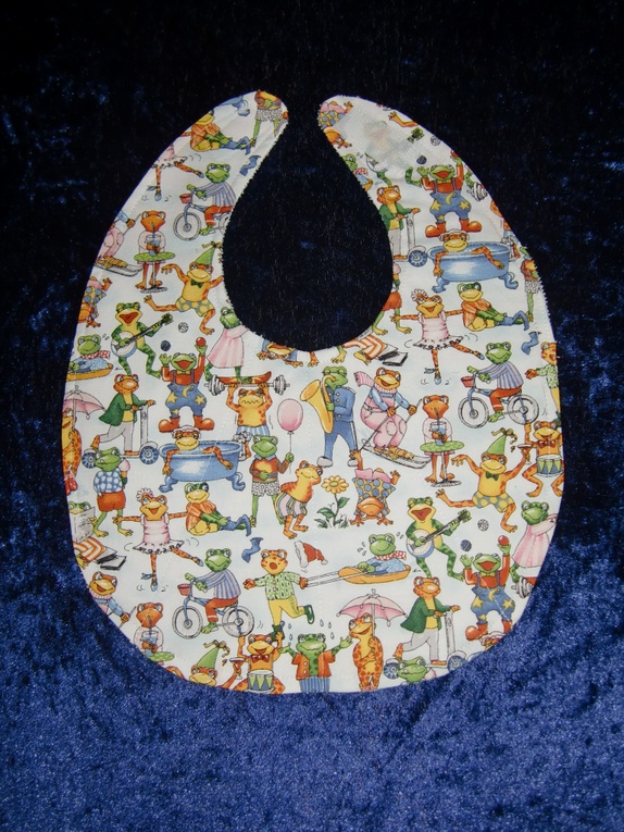 Babysmekke i godt bomullstoff med hvit plastfrotte på baksiden. Dette hindrer at gullungen blir våt på klærne under smekka.Tåler mange, mange omganger i vaskemaskinen.Lukkes med borrelås.Smekka Måler 17 cm. ned fra halsgropen.