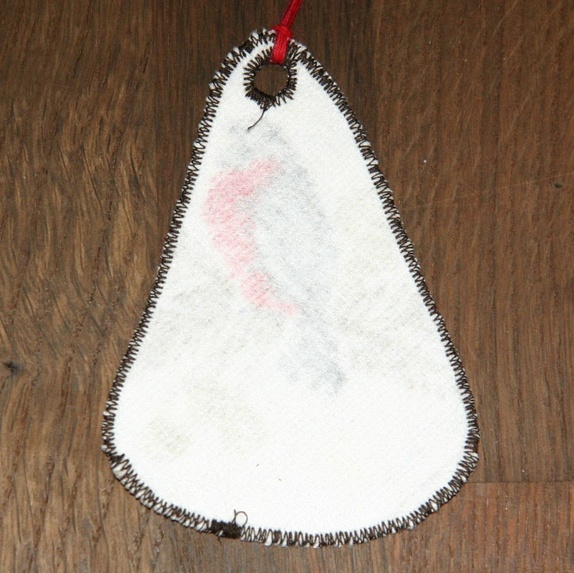 Disse søte til/fra-lappene er sydd av to små julebrikker med dompaper og julestjerner på. Kantene er kastet over med brun sytråd.