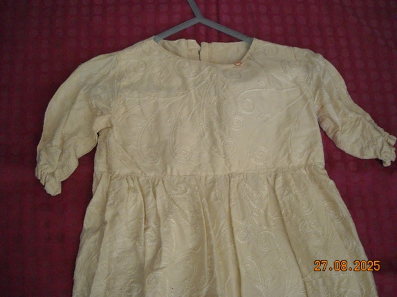 Dåpskjole sydd i silke med broderier, kjolen er kremhvit.Knappelukking i rygg.