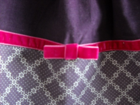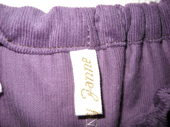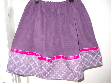 Nydelig skjørt i mørk lilla cordfløyel og bomull, pyntet med rosa fløyelsbånd. Strikk i livet. Finvask 30 grader i maskin. Str: ca 4-5 år. Lengde 36 cm.