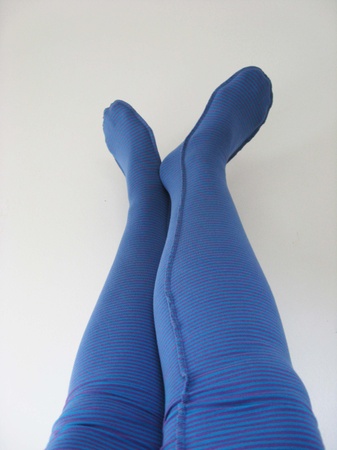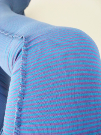 Lange, deilige knestrømper som rekker godt over knærne. De er sydd i lilla og mellomblå, smalstripete bomullsjersey. Knestrømpene er fasongsydd med en dekorativ overlocksøm på utsiden. De finnes i 2 størrelser: 36-38 og 39-41.