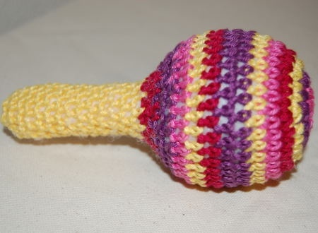 Babyrangle inspirert av 1970-tallet, heklet i bomullsgarn i ulike farger. Ranglen er fylt med fiberfyll, og har en liten bjelle inne i seg.