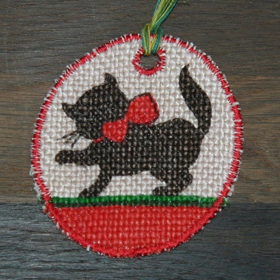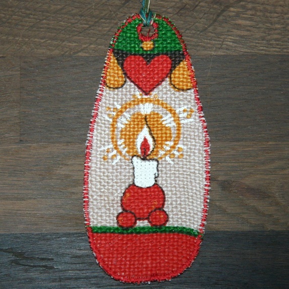 Disse gavelappene er laget av en liten strieduk fra loppis. Kantene er kastet over med rød sytråd og snora er vevrenning som også kommer fra loppemarked.