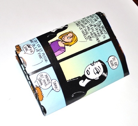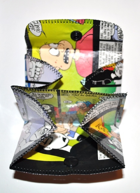 Denne lommeboken er laget av en gammel tegneserie side som har blitt laminert for å gjøre den holdbar. Den har to rom og plass til både bankkort, mynter og sedler.