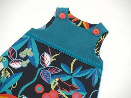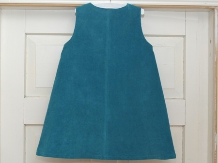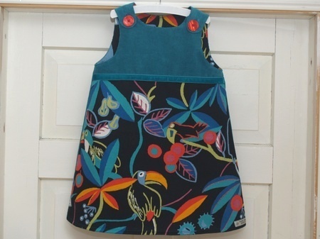 Fargerik hengslekjole med god passform som barnet kan vokse i. Sydd av en blågrønn cordbukse i 95% bomull/5% spandex og multifargete gardiner i ren bomull. Kjolens overdel er foret med det samme stoffet som utgjør forstykkets underdel. Pyntet med et petrolfarget fløyelsbånd og store, røde knapper.