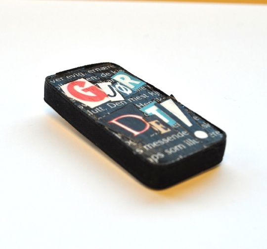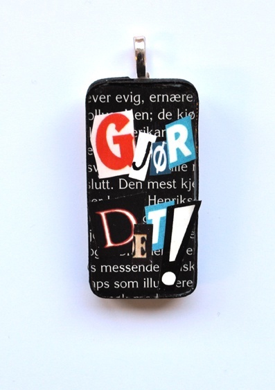 Dette anhenget består av en dominobrikke som er dekorert med forskjellige ting som feks papir utklipp, servietter og bånd for å skape en liten unik og dekorativ collage. Overflaten er beskyttet av 3 lag blank lakk.