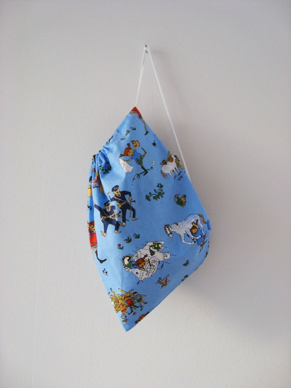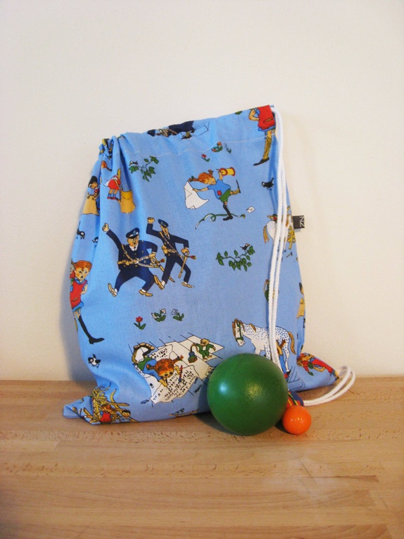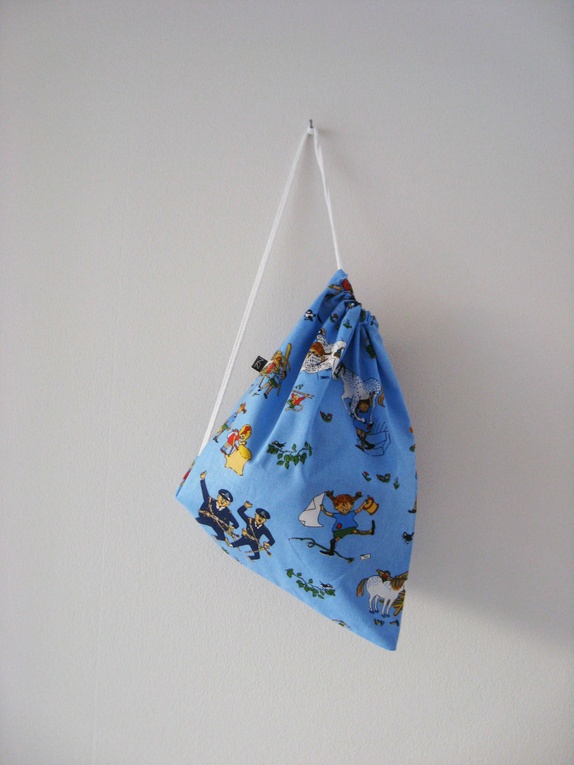 Gammeldags gympose sydd i bomull med himmelblå bunn og kjente figurer fra Pippi Langstrømpes verden. Posen har snørelukning med åpning på toppen.