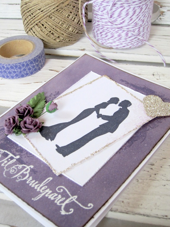 Det er pyntet med lillafarget papir med shimmer, et håndstemplet motiv av et brudepar i silhuett, fiolette roser og et hjerte med sølv glassglitter. "Til brudeparet" er håndstemplet i hvit embossing (forhøyning).
