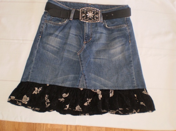 Skjørt i dongeri. Sort kappe m beige mønster nederst. Sort belte.Str 29