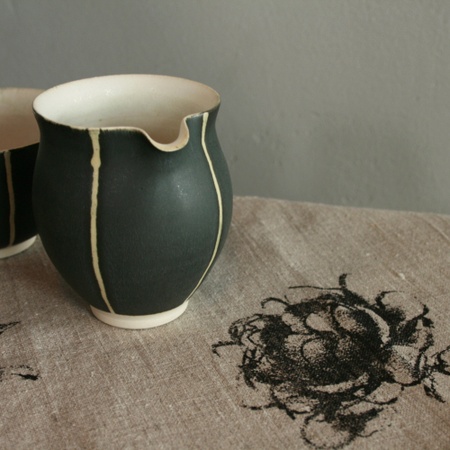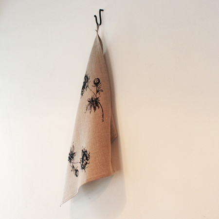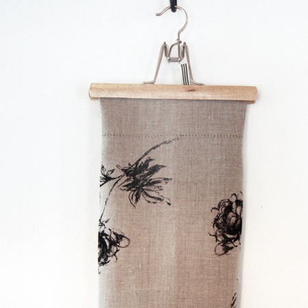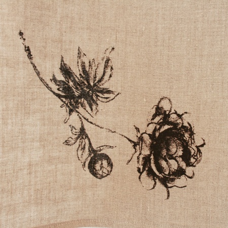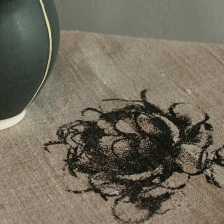 -Naturfarget redesignet lin.-Trykket for hånd med sort trykk.-Trykket er laget etter en kulltegning av en peon fra hagen min.-Mål: ca 44 cm x 62 cm. -Hempe i det ene hjørnet.-Vaskes forsiktig i maskin 40/60 grader.
