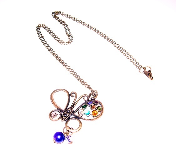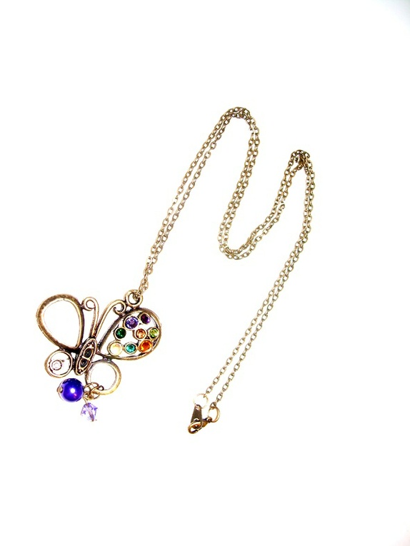 Lengre kjede med et nydelig anheng av kobber. Fattet med swarovskistener i ulike farger. Mørk lilla perleanheng og swarovski.